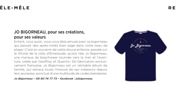 Enfant, vous aussi, vous vous êtes amusés avec ce bigorneau qui passait des après-midis bien sage dans votre seau de plage ! C’est en souvenir de cette douce enfance, passée sur le littoral de la côte d’émeraude qu’est née Jo Bigorneau, une marque de beachwear tournée vers la mer et l’aventure, créée par Geoffrey et Quentin. De fabrication exclusivement française, Jo Bigorneau est un véritable album de famille, qui retrace toute l’histoire de ses créateurs depuis leur jeunesse, ponctué d’une multitude de codes balnéaires.
